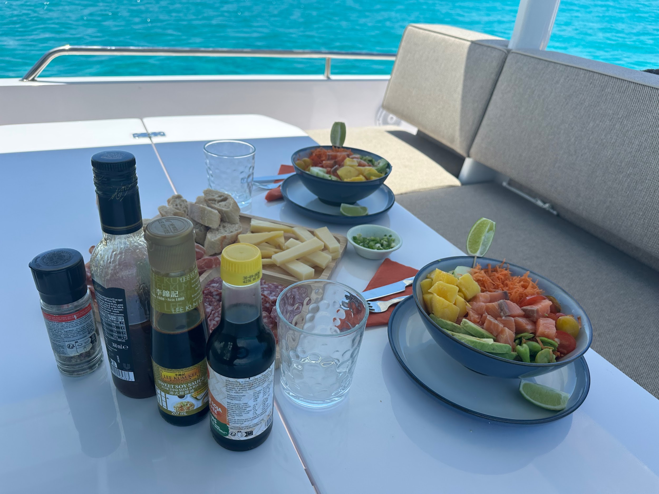 Stretch out on spacious sunbathing areas at the front and back, or unwind under retractable sunshades when you need a break from the heat. A generous dining area seats up to eight guests.