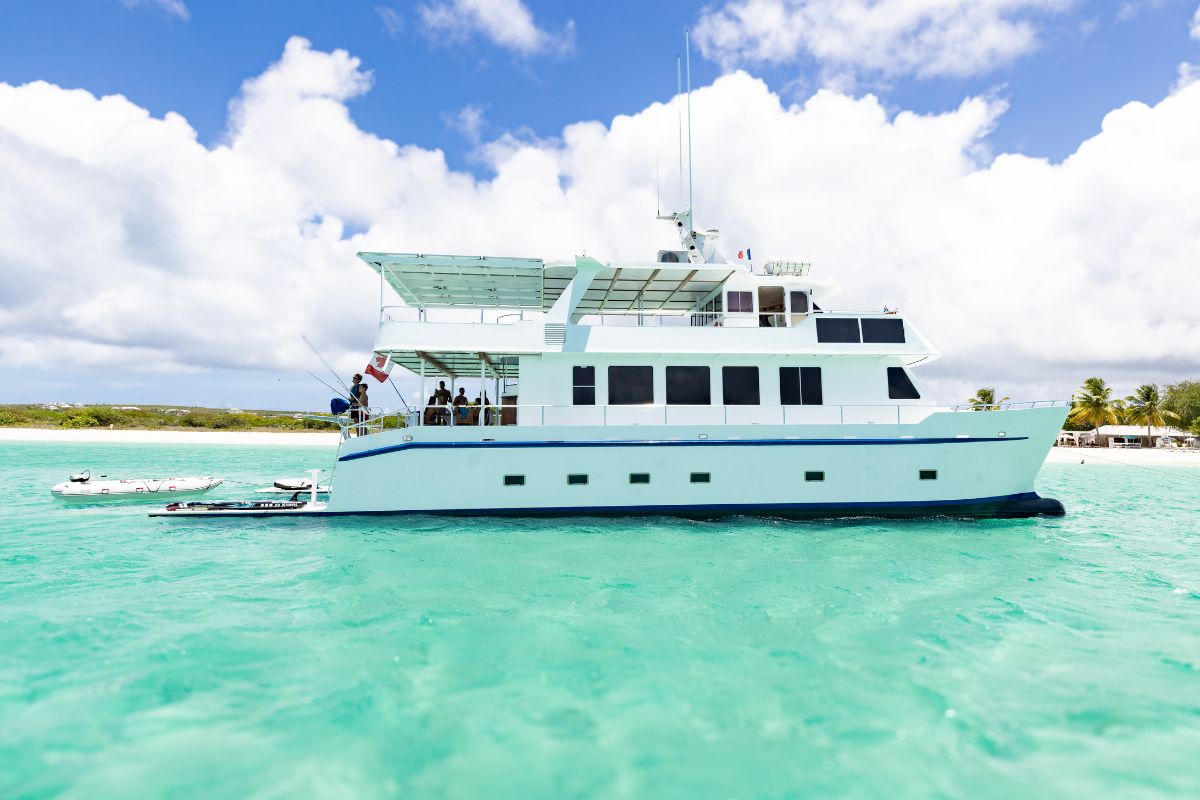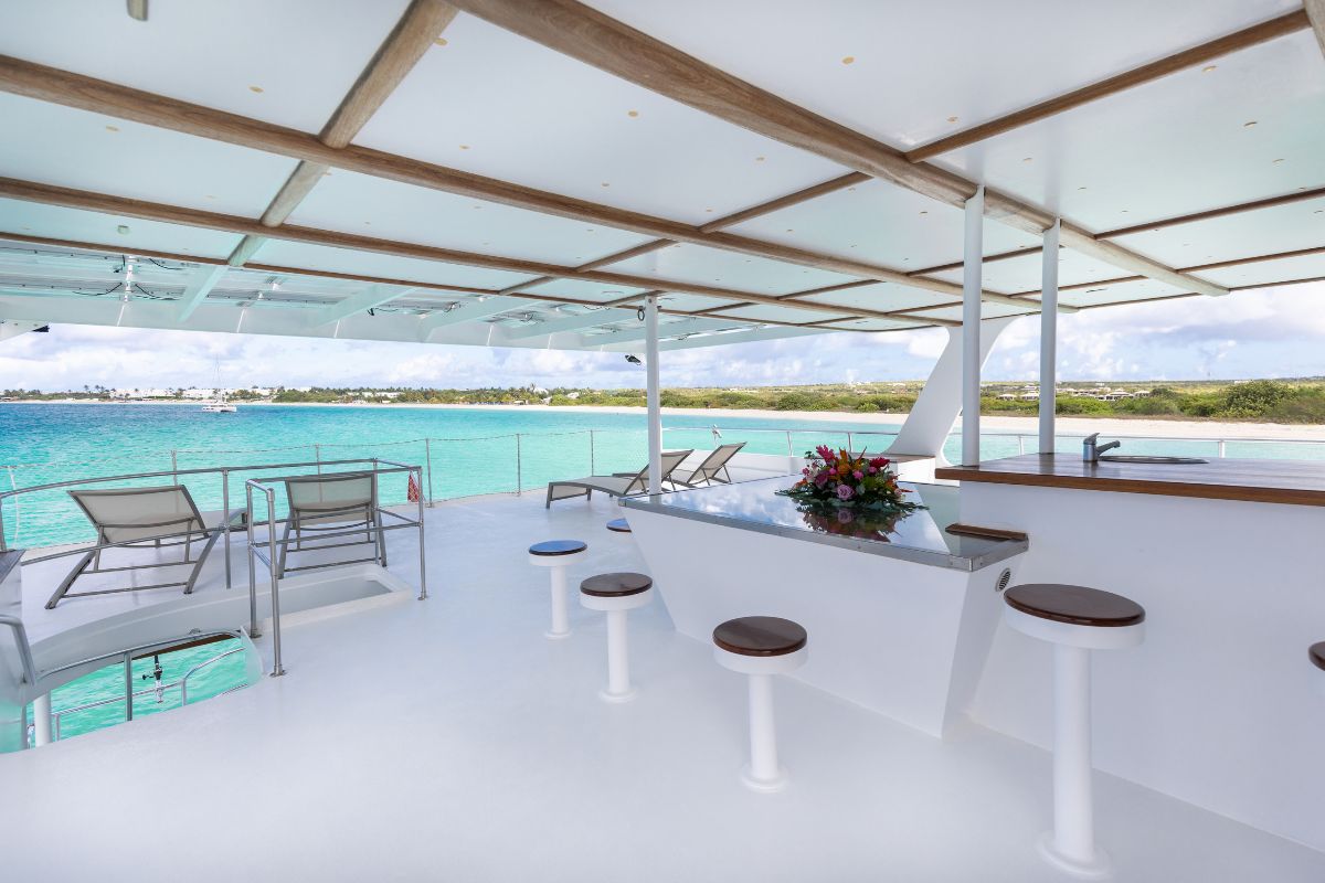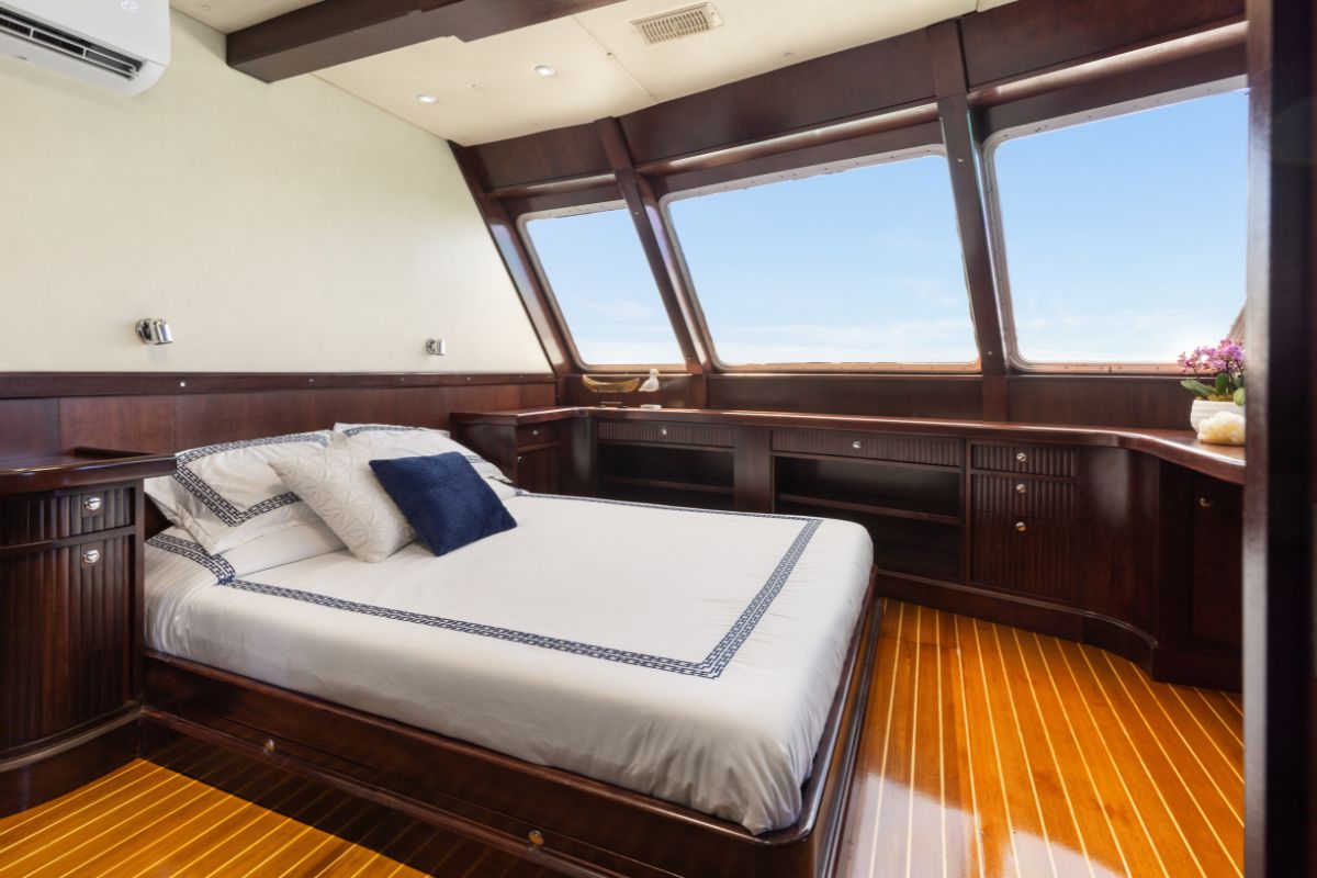 Guest accommodations include two forward Master Suite with a private en-suite bath and panoramic views, as well as two double bed guest cabins, each thoughtfully designed for comfort, privacy, and style. Great storage, and high-end linens ensure a restful retreat after sun-drenched days.