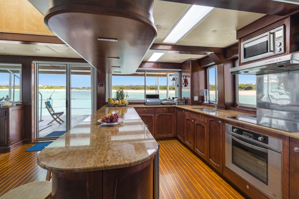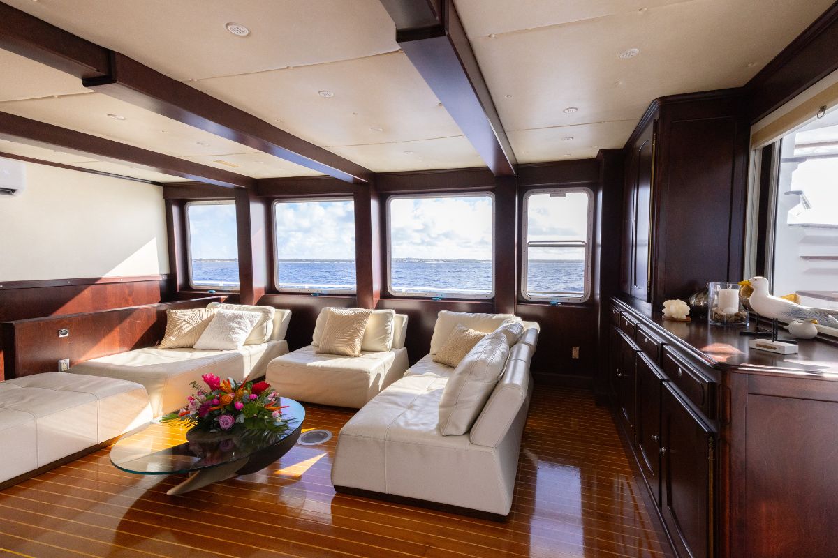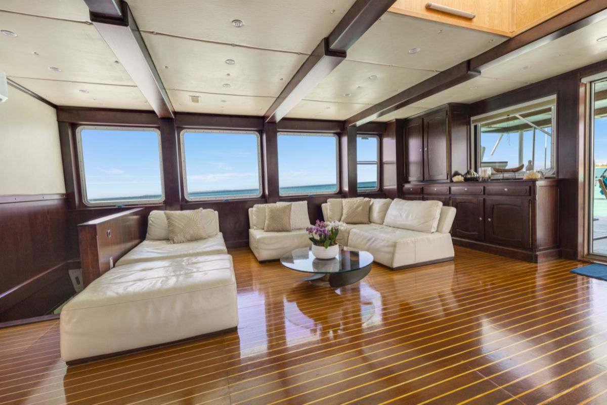 Step inside, and you're welcomed by a large salon with 360° views, framed by wraparound windows. Canadian birch wood, along with teak flooring, give the interior a warm and refined nautical feel. The spacious lounge area features plush seating, a large flatscreen TV, a curated library, and a one-of-a-kind skylight that draws natural light from above.